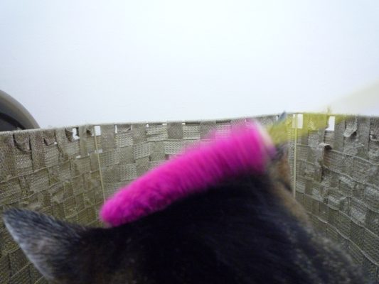 出てきてもらおうと、ねこじゃらしで頭をベシベシ叩いてみましたが振り向いてもくれませんでした