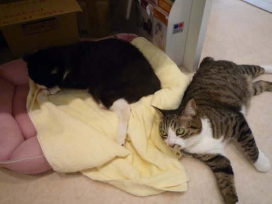 寝床を取りに来ているのはたまに見かけますが、今日はお互い適度な距離で寛いでいて微笑ましいです♥