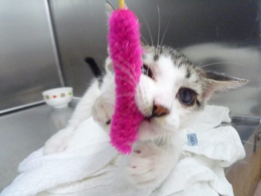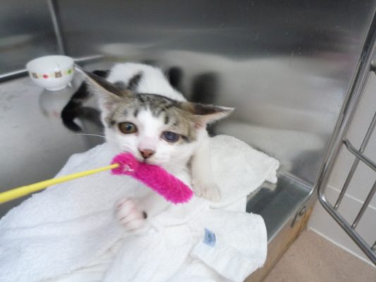 駐車場で捕獲したこねこちゃんはエイズ白血病の検査の結果、陰性でかかっておりませんでしたのであとは左眼の傷が薄くなるだけです。