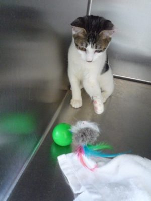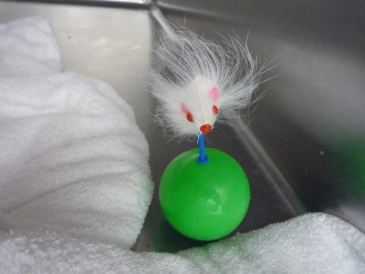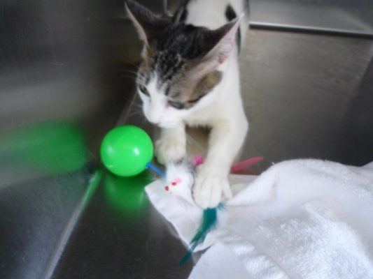 最初はそ~っと触れていましたが、すぐに激しく遊びだし、どんどんねずみの羽が取れてしまい