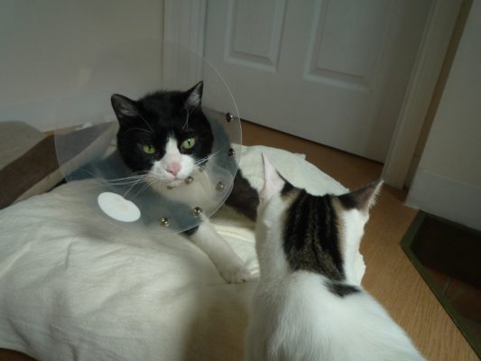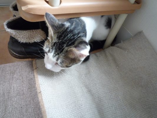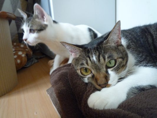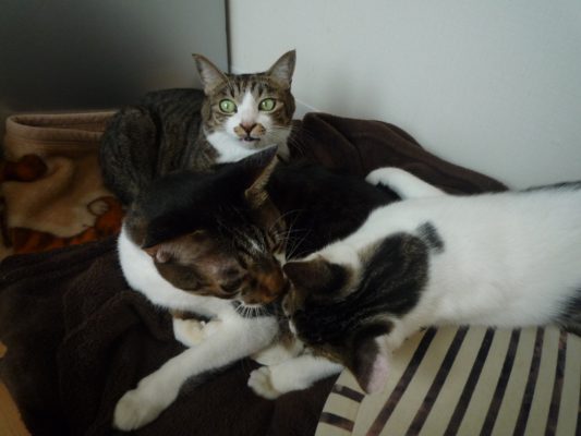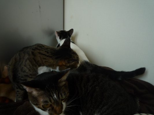 まずは、先に寝ていたちょぼん先輩としゃぼん先輩をチェック!(あいさつではなく一方的に匂いを嗅ぐ)