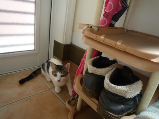 最後は靴箱のスニーカーの紐で遊んでいて、スタッフの休憩にならないのでゲージに戻されて終わりです。