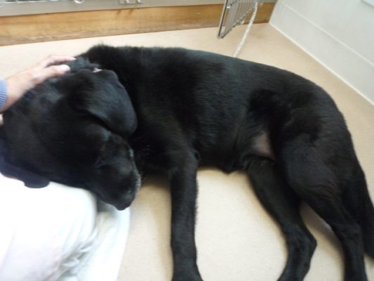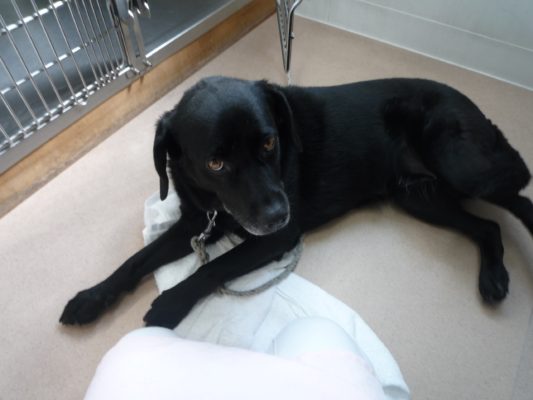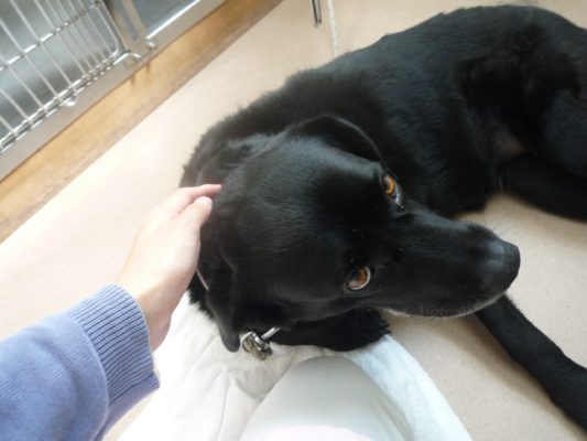 サクラのところに遊びに行くと犬舎の中でリラックスモード。