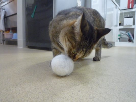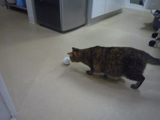 転がしてあげると追いかけていったのですが、いつもと勝手が違うらしくすぐに遊ぶのをやめていました・・・(^o^;)